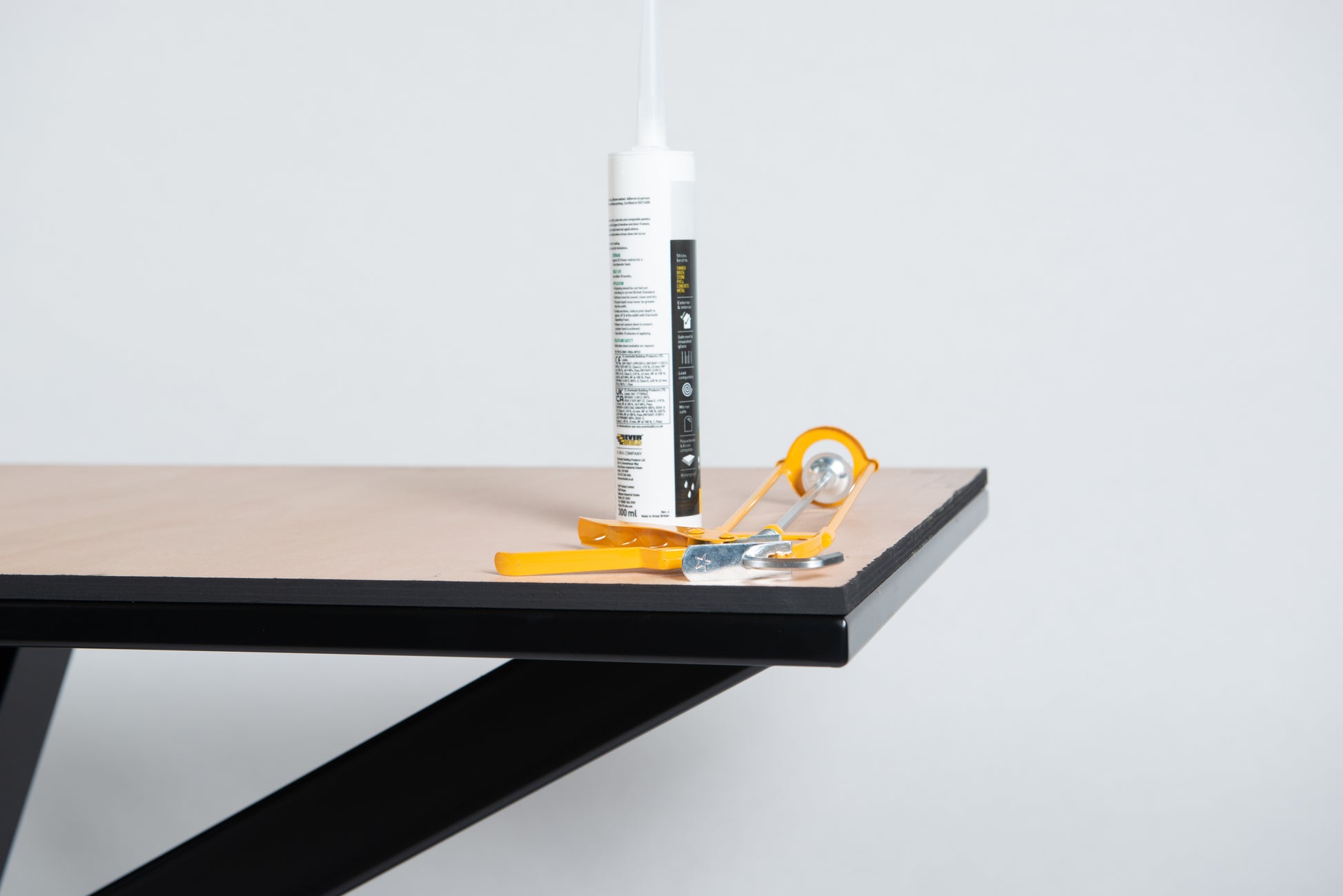 Silicone adhesive and masking gun for use with a plywood sub-top to adhere to all types of stone tabletops.